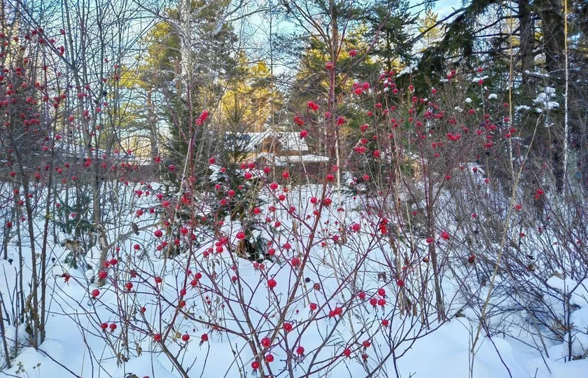 Внутри домика было холоднее, чем на улице. Через пару часов, когда живительный жар от печки стал доходить до промёрзших стен, решил прогуляться по СНТ. В конце улицы, где кончались участки и начинался лес, заметил яркие шарики в зарослях дикого шиповника. Почему не склевали? Это же царская пища, сплошь витаминная. Не заметить такого добра не могли. Подумалось: никак птичья заначка на период трескучих морозов.