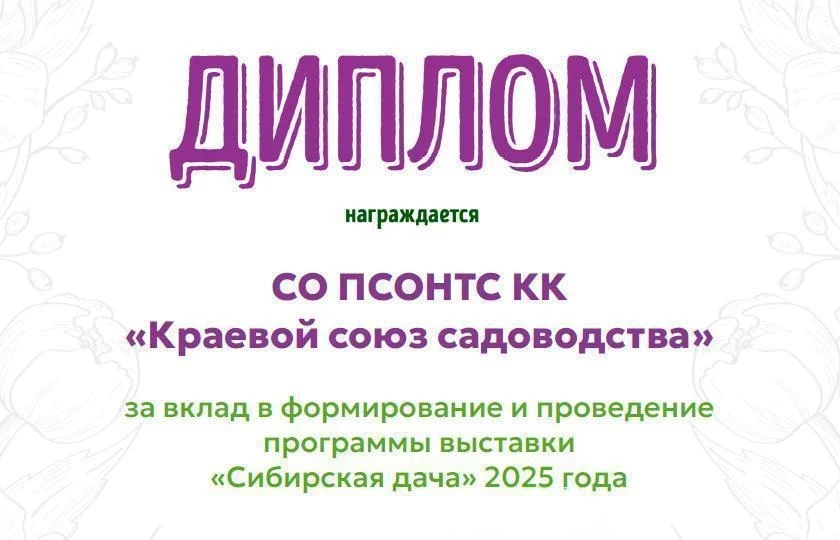 По итогам весенней выставки «Сибирская дача», которая проходила в МВДЦ «Сибирь» с 24 по 27 апреля текущего года, дипломами награждены наиболее активные участники и организаторы выставки. Краевой союз садоводства был представлен многопрофильной площадкой на которой предлагались посетителям консультации по выращиванию плодовых деревьев и кустарников – Пирогов В.И., Пирогов Г.В., винограда – Будрис С.А.. Об особенностях произрастания садовых растений в условиях Красноярского климата, консультации вела – Рещикова А.И. Помимо работы на площадке Краевого союза садоводства С.А. Будрис провел лекцию по выращиванию винограда в климатических условиях Красноярска, а Пирогов В.И. лекцию по плодовым деревьям. Организаторы наградили их дипломами выставки.